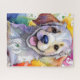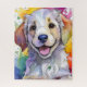 Uma imagem de arte digital de um filhote de Retriever de Ouro com um fundo detalhado e colorido parece alegre e expressiva. Plantações vívidas de cores moldam a face do cão, melhorando o seu caráter lúdico e vivo.