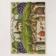 quebra-cabeça de 30" x 20" com vinhedo, garrafas de vinho, óculos, barril e saca-rolha. O padrão de texto dos tipos de vinho atrás das garrafas e banner com uvas no topo diz "Um pouco de vinho - Ria muito". 1014 peças.