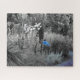 Este quebra-cabeça é um pouco desafiador com muito preto-e-branco...Exceto o visitante do jardim, escondido entre muitas vegetações, vestindo azul. Esta foto foi tirada num lindo jardim botânico, e quando virava a esquina, eu vi os cavalheiros em azul. Eu tinha planejado primeiro atirar no banco sozinho, mas era interessante ver alguém justapsado entre as plantas exuberantes. Se você está montando esta quebra-cabeça com sua família ou outro grupo, a grande questão é quem consegue as peças azuis?