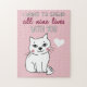 Esta quebra-cabeça romântica apresenta um gato de desenho animado branco e adorável em um fundo rosa com um coração branco. Com a legenda que diz "Quero passar as nove vidas com você", é o presente perfeito para declarar seu amor eterno.