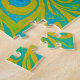 Esta elegante quebra-cabeça de serra-gigante da natureza pacífica vai dar-te horas de diversão. O pássaro está em cores de turquesa, verde e azul em um fundo de padrão amarelo. Imagem gerada com IA.