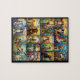 Quebra-cabeça de serra com mais de 12 raças diferentes de cães artisticamente feitos em modo de janela de vidro colado.