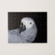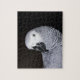 Um fim acima do tiro de um papagaio do cinza africano de Congo em um quebra-cabeça.