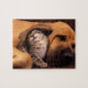 Quebra-cabeça de jogo mostrado com uma impressão de foto de um gatinho e cachorro bonitinho sendo amigos rapados. Personalize este item ou comprar como está. Imagem do stock
