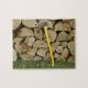 Fotografia ordenadamente de uma pilha da madeira com um machado segurado amarelo que inclina-se contra ele,