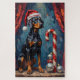 This bold digital illustration captures the striking elegance of the Doberman Pinscher, shown wearing a festive Santa hat while skillfully balancing ornaments next to a giant candy cane. A sleek and memorable holiday design for Doberman owners.