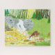 A large jigsaw puzzle with a beautiful forest scene including doe and fawn drinking from a stream near a waterfall. Original artwork by W.B.