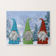 Um quebra-cabeça fantástico com aqueles gnomos de inverno bonitos vestidos em suas roupas de inverno perfeitas para o Natal e a época de inverno. O fundo é uma bela cena de inverno com pinheiros cobertos de neve.