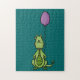 Um pequeno dragão de desenho verde, bonito, com chifres amarelos e uma ligeira sobrecarga, de pé com as mãos atrás das costas, segurando um balão roxo. Arte digital original de Taylor Addams.