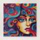 Um retrato colorido apresenta uma representação abstrato do rosto de uma mulher cercada por padrões giratórios em tons de azul, vermelho e laranja. Seus olhos são grandes com chocos proeminentes, e as curvas estilizadas e formas dão à composição uma atmosfera de sonho.