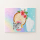 quebra-cabeça com elefante de nuvens brancas com coroa sentada ao lado de um tronco com flores rosa