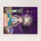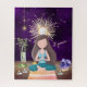 Esta bela quebra-cabeça apresenta uma bela menina meditando num tapete de ioga cercado por cristais, velas e bambu de sorte numa sala bela com uma parede roxa profunda e chão azulejo e trabalho de arte ouro. O texto diz "em paz..." mas pode ser alterado para incluir um nome!