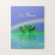 Uma ideia divertida de presente, esta quebra-cabeça tem uma bela imagem tridimensional de corações esmeraldas flutuando na água sob um arco-íris com texto personalizável.