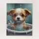 Animais de estimação adoráveis sentados numa banheira, com gotículas de água e bolhas à sua volta. O filhote olha para o espectador com olhos largos e inocentes, e suas pequenas patas estão na borda da banheira. A atmosfera é bonitinha e humorística, fazer ideal para um conjunto de poster.