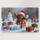 Um espanhol tibetano alegre corre brincalhão através da cena do inverno nevado, vestindo um chapéu de Natal vermelho festivo. Este charmoso design põe em evidência o casaco, rosto expressivo e o espírito vivo da raça, enquanto se captura o calor e a alegria da época de férias. Um cheio de alegria festiva no inverno.