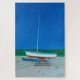 Uma pintura de um único veleiro em um estaleiro em um final de dia de primavera com um céu azul profundo ao fundo. A obra de arte é sobre esperar o verão começar na Nova Inglaterra e a diversão na água que vem com viver em uma cidade costeira.