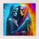 Dois Skeletons se abraçando sob um cobertor com fundo arco-íris.