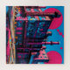 Uma paisagem industrial complexa é representada por estruturas de reboque silenciadas contra um céu verde. Um círculo azul em negrito contrasta com as nuvens texturizadas no fundo.