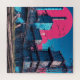 Uma paisagem industrial complexa é representada por estruturas de reboque silenciadas contra um céu verde. Um círculo azul em negrito contrasta com as nuvens texturizadas no fundo.