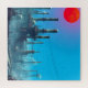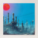 Uma paisagem industrial complexa é representada por estruturas de reboque silenciadas contra um céu verde. Um círculo azul em negrito contrasta com as nuvens texturizadas no fundo.