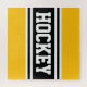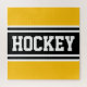 Este design atlético divertido apresenta texto ousado HOCKEY dentro preto e branco de faixas de corrida contra fundo amarelo brilhante. As cores e o texto neste design podem ser personalizados.