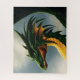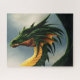 Perfil de retrato de um dragão verde. Céus azuis atrás do dragão.