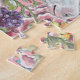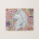 Um bonito unicórnio branco está desfrutando de um jardim de fantasia repleto de flores tropicais em tons roxos, roxos e corais. Belo trabalho de arte de aquarela é excelente para amantes de unicórnio de qualquer idade! Um design mágico que certamente oferece um desafio intrigante. Arte original e design de Tuzi Williams.