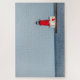 O farol vermelho octogonal Menominee Pierhead se destaca contra um céu azul claro e água azul mais escura. Está no lado Michigan da fronteira estadual com Wisconsin, no lago Michigan. Em 1927, o farol foi desmontado para construir um prédio de concreto quadrado para abrigar uma buzina elétrica. O farol de 1877 foi então remontado no topo do edifício quadrado.