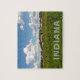 Fotografia colorida de uma fazenda em Indiana com um celeiro vermelho, céu azul e animais de fazenda.