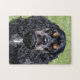 Esta quebra-cabeça de serra tem uma foto de perto da face de um cachorro Cocker Spaniel macho, de 18 meses, com grama verde atrás.