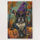 Abraçar o espírito do Dia das Bruxas com esta design encantadora que apresenta um cachorro fofo num chapéu de bruxa rodeado por abóboras entalhadas. Perfeito por adicionar um pouco de charme assustador às suas comemorações festivas.