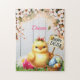 Pintinho de bebê bonito desejando que você Felz pascoa com ovos coloridos em uma cesta. Você também pode personalizar isso com um nome de garota