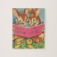 Este adorável quebra-cabeça apresenta uma ilustração antiga de dois coelhos segurando um livro rosa que diz "Felz pascoa para você", rodeado por flores e um casal de pintinhos de bebês enquanto um pássaro azul canta junto.