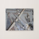 Esta Quebra-cabeça de Jigsera apresenta uma imagem de ferramentas que se posicionam em uma mesa de mercado de pulgas com etiquetas de venda.