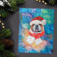 O Bulldog Breed Dog Christmas apresenta uma aquarela de um Bulldog Inglês com um Chapéu Papai noel vermelho, um cachecol de Natal vermelho e uma aquarela galáxica.