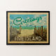 Esta design da "Greeting From Fire Island", uma vintage ilha de bombeiros, apresenta uma praia arenosa com uma bela água turquesa oceânica e acima do mar, um céu azul com nuvens brancas onduladas. No estilo viagens vintage.