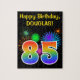 Este design de quebra-cabeça vibrante e divertido apresenta um padrão colorido inspirado em fogos de artifício comemorativos, juntamente com o número "85", que apresenta um padrão multicolorido como um gradiente, num fundo preto colorido. Ele também apresenta um nome personalizado e uma mensagem de evento, como uma saudação de aniversário. Um quebra-cabeça como este pode ser uma maneira divertida de enviar uma mensagem de saudação para celebrar o oitenta quinto aniversário de alguém. [~Z0000329]