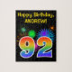 Esta design de quebra-cabeça vibrante e divertida apresenta um padrão colorido inspirado em fogos de artifício comemorativos, juntamente com o número "92" tendo um padrão multicolorido de gradiente, num fundo preto colorido. Ele também apresenta um nome personalizável e uma mensagem de evento, como uma saudação de aniversário. Um quebra-cabeça como este pode ser uma maneira divertida de enviar uma mensagem de saudação para reconhecer o nonagésimo segundo aniversário de alguém. [~Z0000329]
