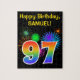 Este design de quebra-cabeça vibrante e divertido apresenta um padrão colorido inspirado em fogos de artifício celebratórios, juntamente com o número "97", tendo um padrão de gradação inspirado no arco-íris multicolor, sobre um fundo de cor preta. Ele também apresenta um nome personalizado e uma mensagem de evento, como uma saudação de aniversário. Um quebra-cabeça como este pode ser uma maneira divertida de enviar uma mensagem de boas-vindas em comemoração do 90° aniversário de alguém. [~Z0000329]