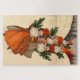 Lovely watercolor painting of five cute little girls in a snowy winter landscape, wearing warm winter coats and hats and furry muffs, carrying holly branches for Christmas. Vintage Christmas illustration by English artist Florence Hardy.