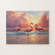 Um trio vibrante de flamingos graciosamente rolando ao longo da praia arenosa, suas penas cor-de-rosa brilhantes contrastando maravilhosamente com o fundo suave do oceano. Esta cena vivida e tropical evoca o espírito descuidado do verão e a tranquilidade ao lado da praia.
