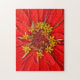 Este lindo quebra-cabeça de flores apresenta minha fotografia original de uma Zinnia vermelha profunda, macro aproximada, mostrando os adoráveis floretes amarelos no centro da flor.