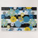 Flores gráficas em preto e branco, em azul e amarelo, sentam-se sobre um fundo listrado em preto e branco. quebra-cabeça excelente para alguém que vive com a forma mais comum de cegueira a cores.