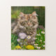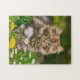 Um gatinho marrom bonito novo do racum de Maine do gato malhado que senta-se curiosa em um prado florido no primavera. Uma foto bonito do gato do coonie tomada por Katho Menden. Este jogo animal do quebra-cabeça da foto é uma ideia do presente para amantes do gato. http://www.zazzle.com/kathom_photo