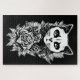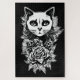 Ilustração gótica de rosto de gato com flores. A atmosfera escura e romântica evocada pelo estilo gótico da imagem soma-se à sua qualidade misteriosa e alarmante.