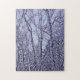 Esta foto gráfica digitalizada, de uma floresta nua e arborizada, é exibida em mudas, cores, violeta, roxo, azul, branco, cinzas e preta nos vestígios persistentes, de um crepúsculo azul pálido.