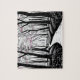 O design é um desenho preto e branco de um caminho em uma floresta. Há uma pequena caminhada por essa floresta onde os observadores vão notar folhas de abstrato roxo pairando sobre a floresta.