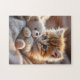 Quebra-cabeça Fluffy red kitten playing with a tiny teddy bear,