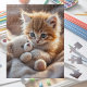 Cute, fluffy red kitten playing with a tiny, soft teddy bear on a cozy, warm blanket. Pretty colors in orange, beige, white. Adorable design for any child!