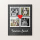 Add 4 of your favorite photographs to this personalized pet memorial puzzle. Four square cropped images are framed nicely in simple white squares, with a small red heart outlined in white in the center and flowing white handwriting script style text on the bottom. Perfect for instagram photographers, or you can crop your photos into a square shape before uploading for greater control over subject placement.